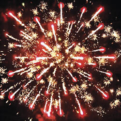 5. Свистящая комета (змейка) разрывается красно-белой мерцающей сферой (пион) и облаком трещащих разрывов (трещащая хризантема).