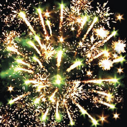 16. 2 уровня: внизу - трещащие букеты, вверху - красные, зеленые или синие звезды и облако золотого треска (трещащий дождь).