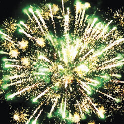 2. Поток трещащих серебряных разлетающихся искр, красные и зелёные огни.