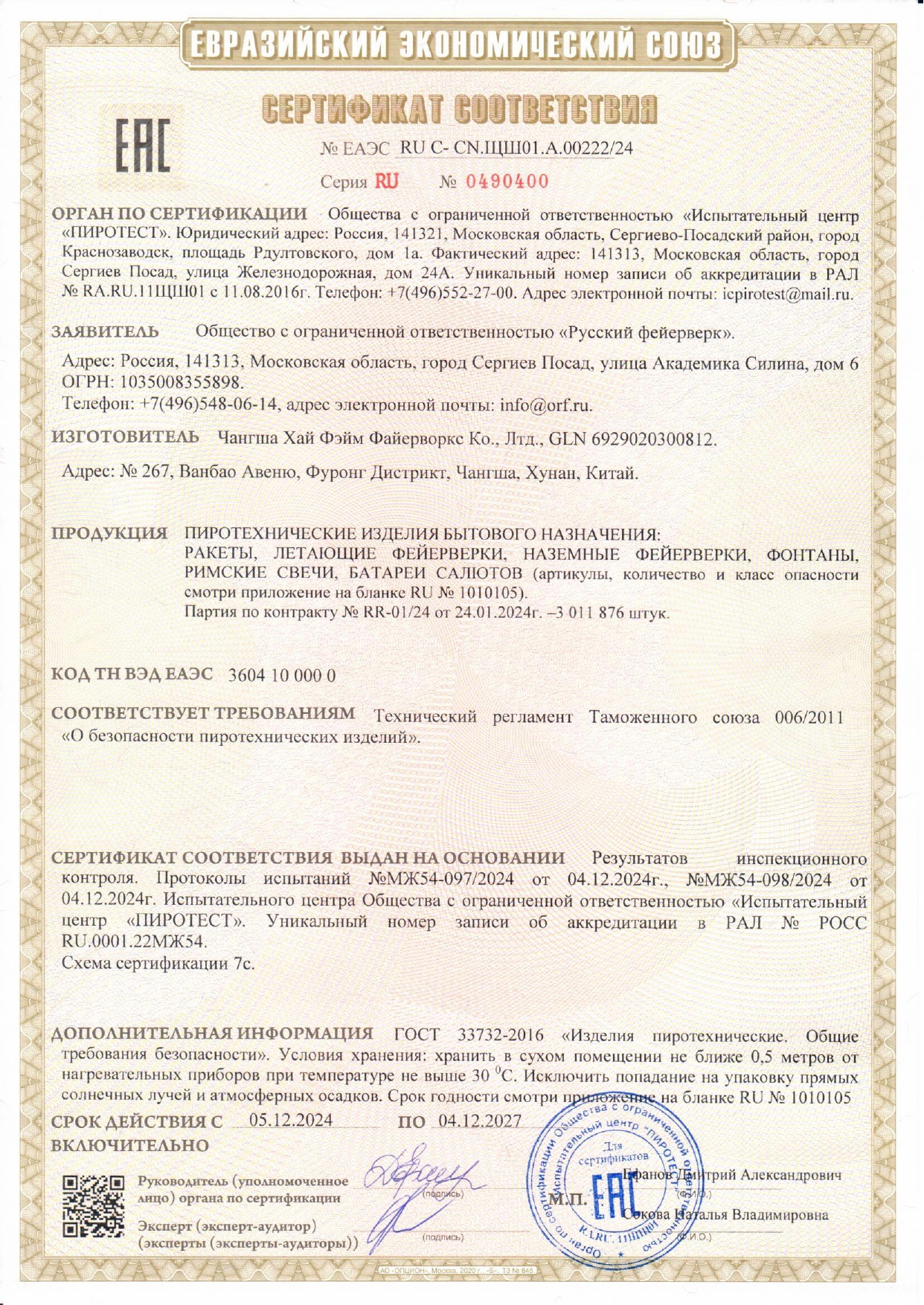 Летающий фейерверк (вертушка). Взлетает с шумом, разбрасывает огненные искры, горит фиолетовым, зеленым огоньком, хлопает.
