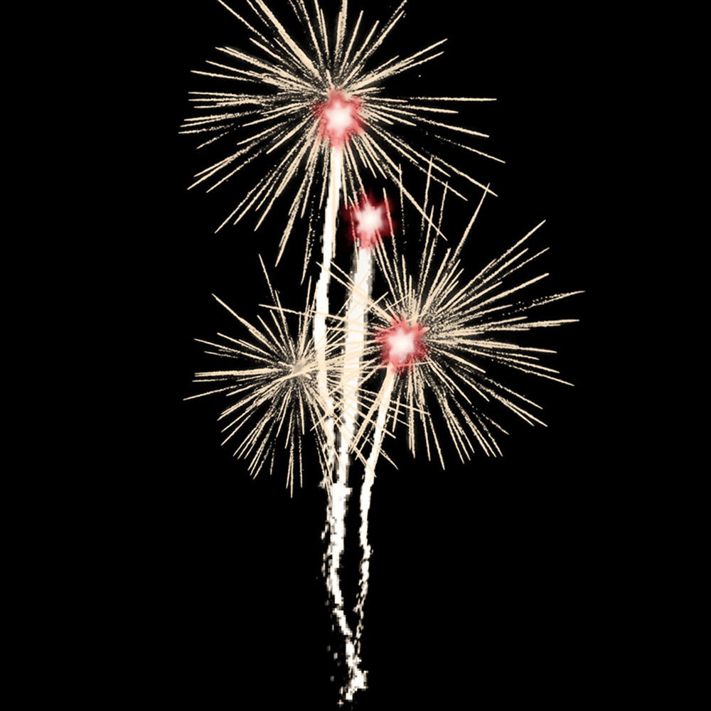 5. Веер. 3 потока серебряных трасс, переходящих в золотые, с красными и зелёными огнями на концах; маленькие серебряные трещащие сферы.