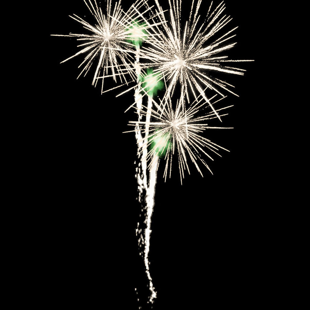4 эффекта: Сине-красно-белая мерцающая сфера (пион). Красно-зеленая сфера (пион) и облако треска (трещащая хризантема). Красные и зеленые звезды с пышными хвостами (кокос). Серебряные звезды с пышными хвостами (кокос) и облако треска (трещащая хризантема).