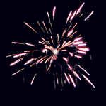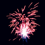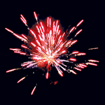 Красный, голубой салют с искристыми хвостами, синяя сфера.