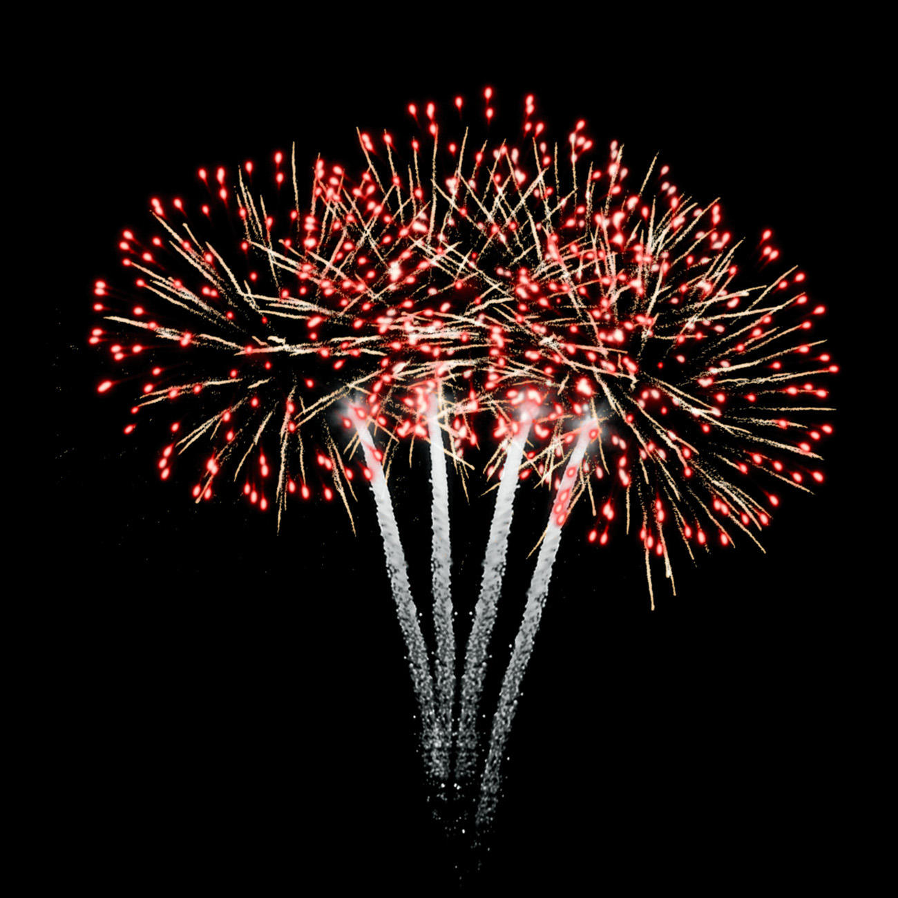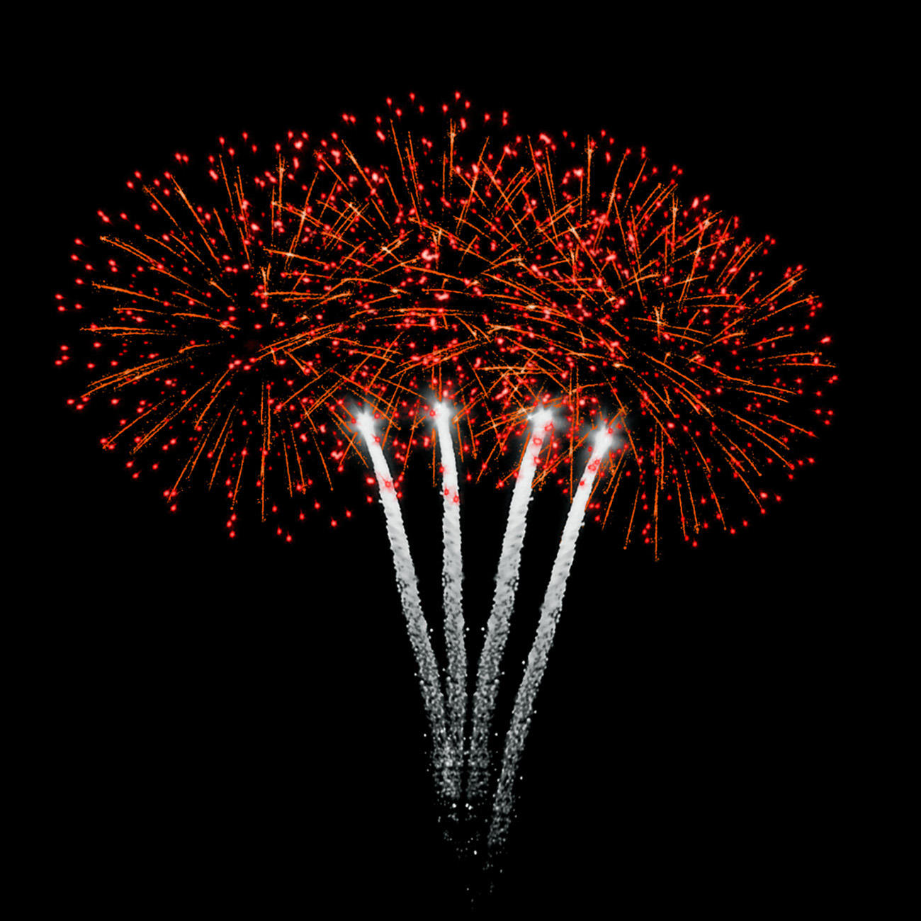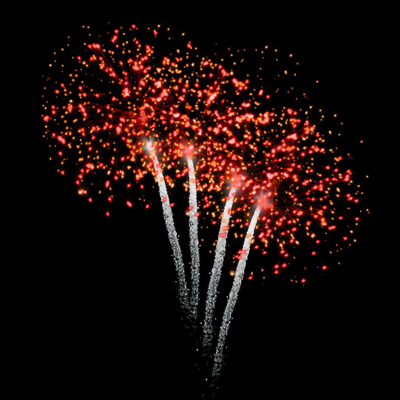 2. Веер. Серебряные трассы разрываются сферами из красных огней и серебряных форсов;