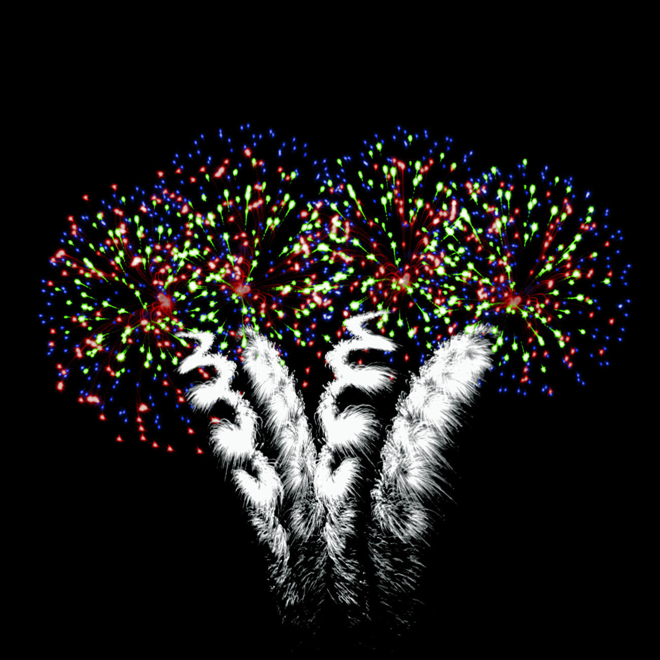 4. Веер. Зигзагообразные трассы разрываются сферами из красных, зеленых и синих огней;