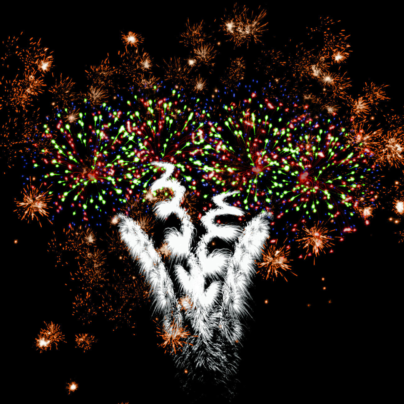 1. Веер. Серебряные трассы разрываются сферами из красных и золотых мерцающих огней;