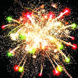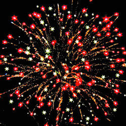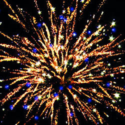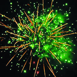 4. Красочная концовка: Красно-зеленые звезды с пышными хвостами (кокос) и облако трещащих разрывов (трещащий дождь).