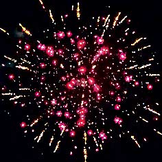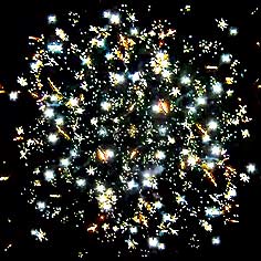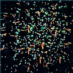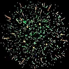 Красная и зеленая звезды разрываются красными и зелеными мерцающими звездами и золотыми мерцающими кометами. Синяя и красная звезды разрываются белыми мерцающими и серебряными трещащими звездами и золотыми мерцающими кометами.
