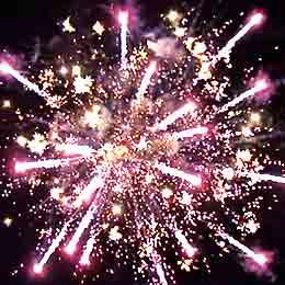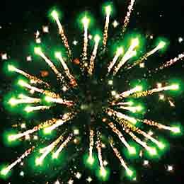 Красные, синие, зеленые звезды с белыми хвостами, треском и белым мерцанием. Белые кометы и облако трещащих разрывов.