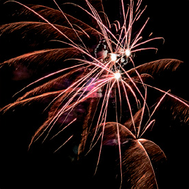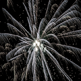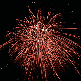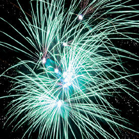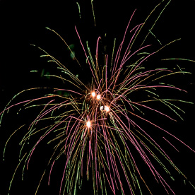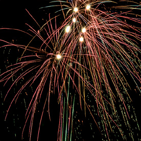 Разноцветные кометы разрываются сферами из: зеленых с золотыми форсами и фиолетовых огней; красных и белых мерцающих огней; красных, зеленых и фиолетовых огней; голубых и золотых мерцающих огней; золотых, зеленых огней и множества трещащих сфер; золотых форсов с трещащими мерцающими искрами.
