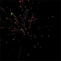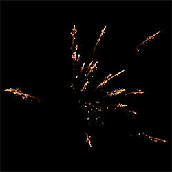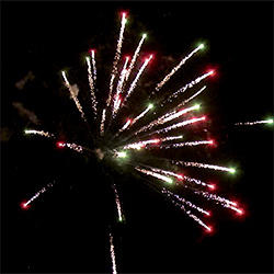 5 эффектов. Разноцветные кометы разрываются сферами из: красных, синих и серебряных мерцающих огней, золотых форсов с красными и зелеными огнями на концах, серебряных искристых форсов с красными и зелеными огнями на концах, золотых форсов с красными искрами, красных и зеленых огней; серебряных искристых форсов; множества трещащих разлетающихся серебряных искр.