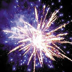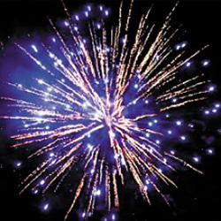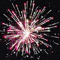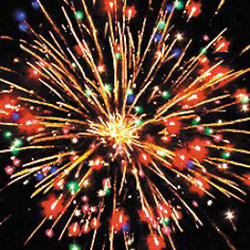3. Сфера золотых хвостов с переходом в красные и зеленые звезды (цветная хризантема) и треск.