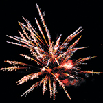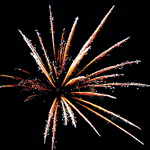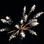Разрывы золотыми хвостами, переходящими в голубые и серебряные мерцающие звезды, белыми трещащими хвостами. В конце трещащий залп.