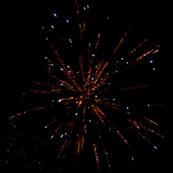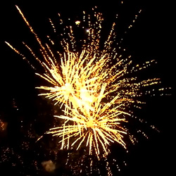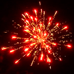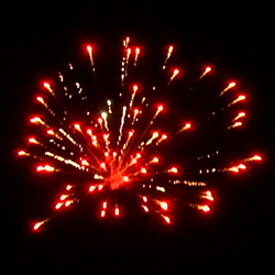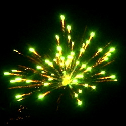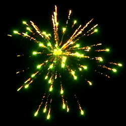 7 эффектов. Чередующиеся разрывы из букетов 1. красные огни и форсовые золотые трассы; 2. зеленые огни и расходящиеся мерцающие трассы; 3. синие огни и золотые разлетающиеся форсы; 4. красные огни и белое мерцание; 5. зеленые огни и золотые форсы; 6. золотые форсовые трассы; 7. золотые трещащие искры.