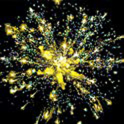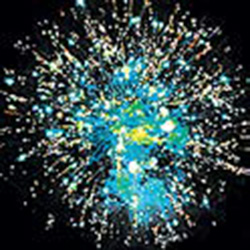 Искристые трещащие трассы разрываются сферами из: красных огней и серебряных трещащих швермеров; синих огней и серебряных трещащих швермеров; желтых огней и серебряных трещащих швермеров.