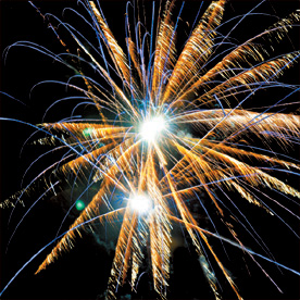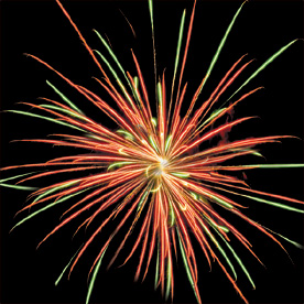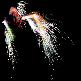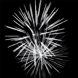 Модуль. Разноцветные кометы разрываются сферами из: красных и зеленых огней с форсами; белых мерцающих огней; синих, зеленых мерцающих огней и парчи; красных огней и золотых форсов с шуршащими искрами. Падающие букетики из фиолетовых, желтых, зеленых разбегающихся огней.