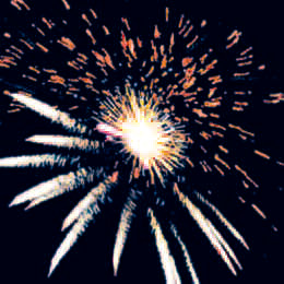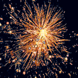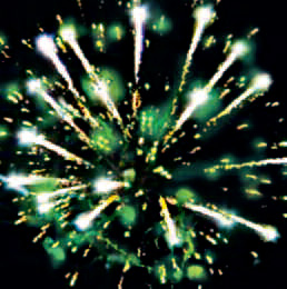 Красные, зеленые, голубые мерцающие сферы с серебряными хвостами в центре. Красочный финал: красные звезды разрываются трещащим салютом.
