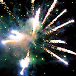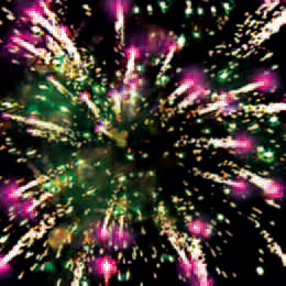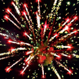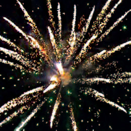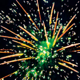 Залп разрывается: красными или фиолетовыми звездами с белыми хвостами и зеленым мерцанием. Золотыми звездами или золотыми кометами с зеленым мерцанием.