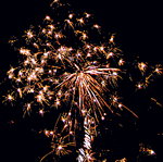 Золотая змея, поднимаясь от земли, разрывается ярким красным, синим, зеленым салютом на фоне золотых мерцающих облаков.