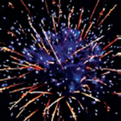 3. Золотая комета разрывается множеством золотых ниспадающих нитей (парча) и синей сферой (пион).