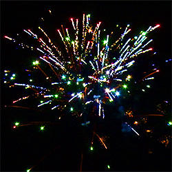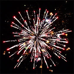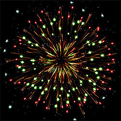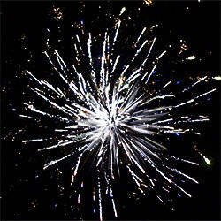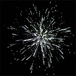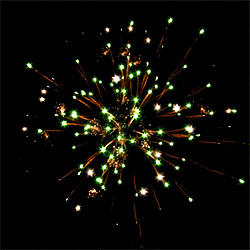 6 эффектов. Разноцветные кометы разрываются сферами из: серебряных форсов и зелёных мерцающих огней, золотых искристых форсов с зелёными огнями на концах и трещащих огней, серебряных форсов с красными огнями на концах и белых мерцающих огней, золотых искристых форсов с красными и зелёными огнями на концах, серебряных форсов с зелёными огнями на концах и трещащих разлетающихся искр, серебряных форсов и синих огней.