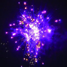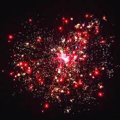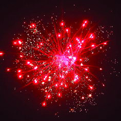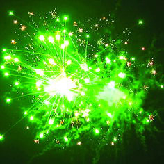 Серии разноцветных звезд разрываются сферами красных, зеленых и фиолетовых звезд и треском, сферой синих звезд и трещащим облаком, сферой цветных разрывов и треском.