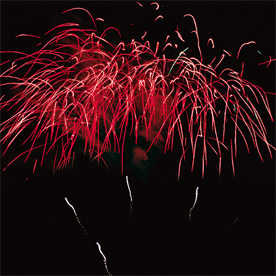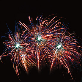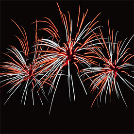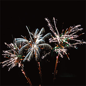 Веер. Разноцветные кометы разрываются сферами из: красных мерцающих и золотых огней; белых мерцающих и золотых огней; красных и синих огней; золотых форсов с трещащими искрами.