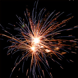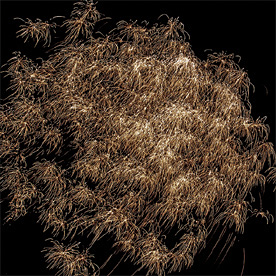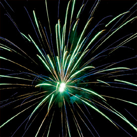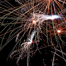Разноцветные кометы разрываются сферами из: зеленых и синих огней; крупных желтых и синих огней; множества трещащих сфер (залп). Трещащие серебряные рыбки.
