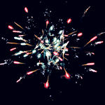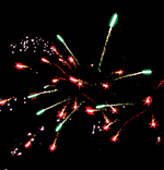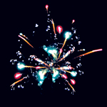 Красные,синие,зеленые кометы разрываются золотыми коронами на фоне множества серебряных мерцающих звезд.