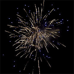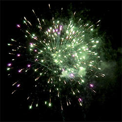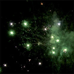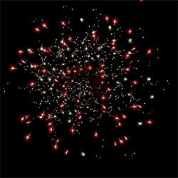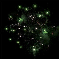 4 эффекта. Разноцветные кометы разрываются сферами из: красных огней и множества трещащих искр, зеленых огней и множества трещащих искр, фиолетовых и зеленых мерцающих огней, синих огней и золотых форсов (залп).