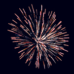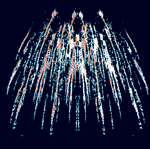 Серебряные нити разрываются серебряными хризантемами с красными и синими кончиками.Финал:два больших серебряных паука.