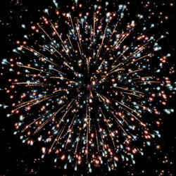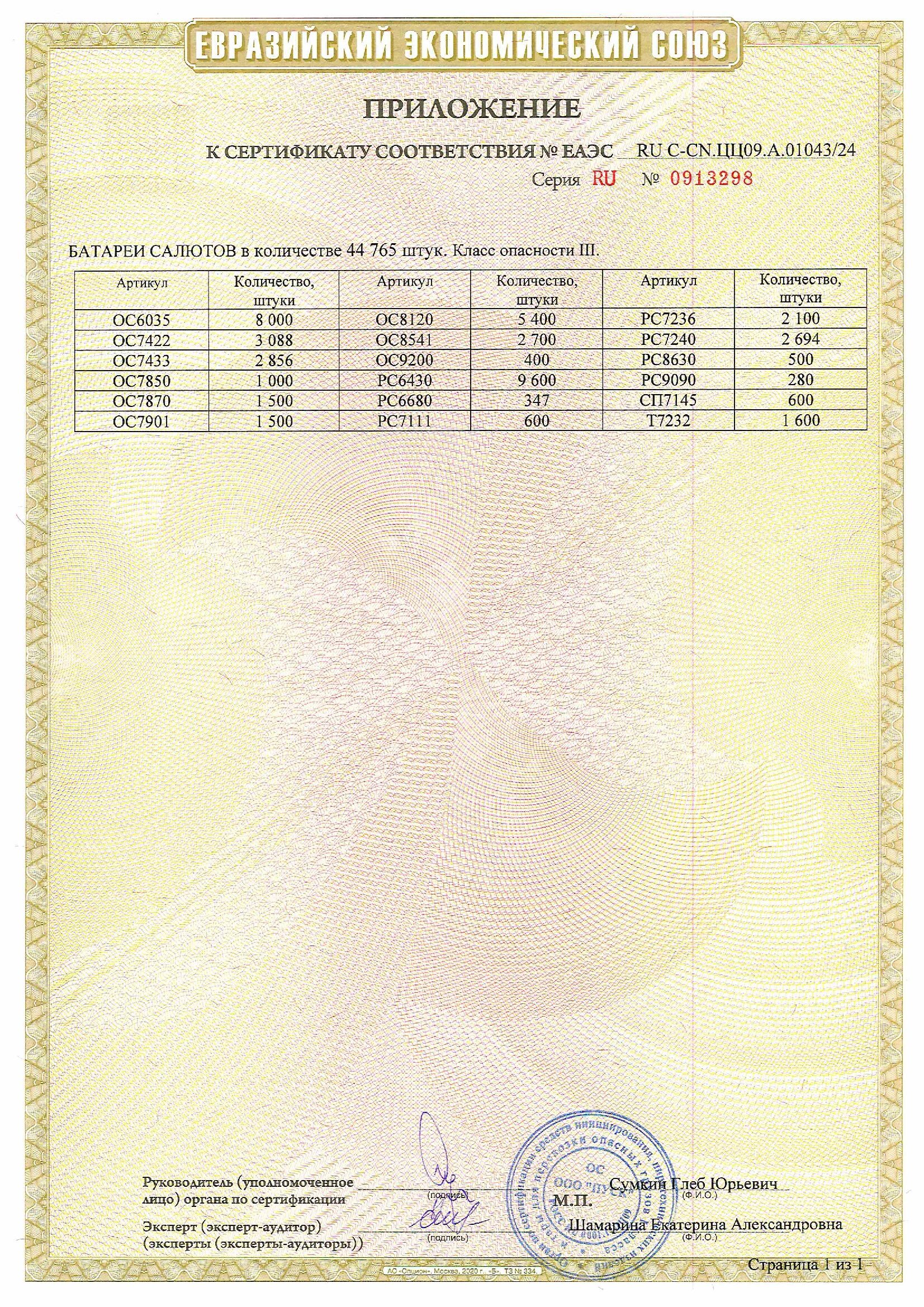 5. золотых форсов с красными мерцающими искрами, голубых и зелёных огней (залп).