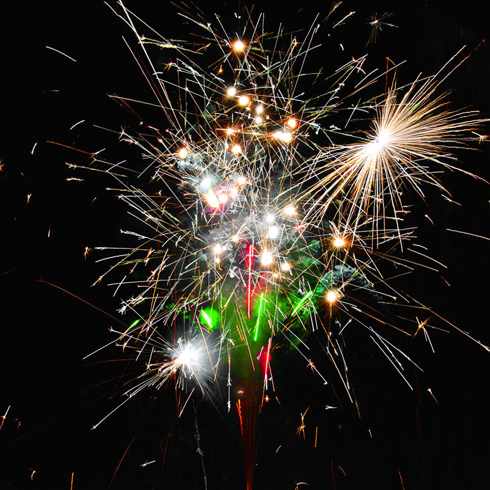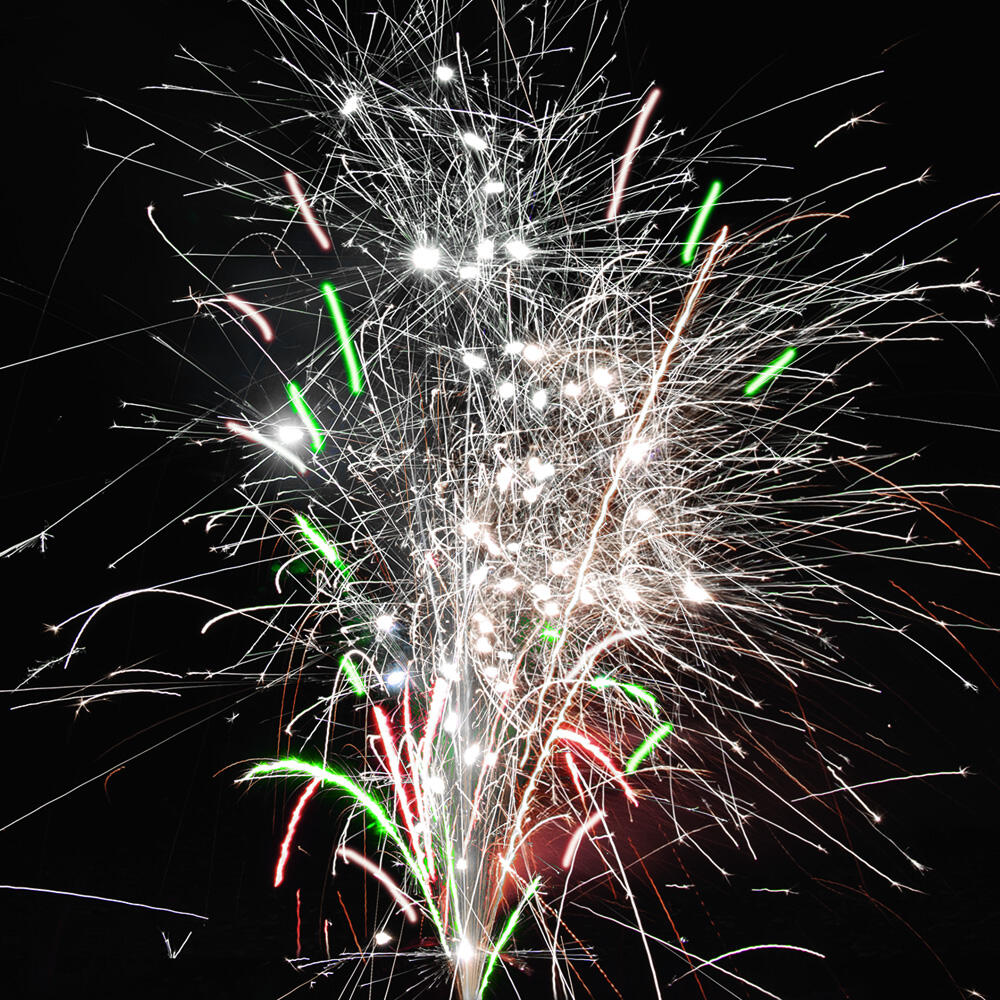 2. Поток серебряных трещащих разлетающихся искр, красных и зелёных огней. Фонтан №5: 2 эффекта
