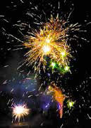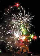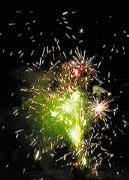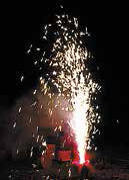 Красное пламя в основании и поток серебряных звездочек; поток красных, зеленых и разлетающихся трещащих серебряных огней; зеленое пламя в основании и поток серебряных звездочек; поток синих, зеленых и разлетающихся трещащих серебряных огней; фиолетовое пламя в основании и поток серебряных звездочек; поток красных, зеленых и разлетающихся трещащих серебряных искр; синее пламя в основании и поток серебряных звездочек; поток красных, зеленых и разлетающихся трещащих золотых огней; желтое пламя в основании и поток серебряных огней; поток желтых, фиолетовых и разлетающихся шуршащих серебряных огней; вертикальный фонтан: – синее пламя в основании и поток серебряных огней, потом поток красных, синих и зеленых огней и серебряных трещащих искр; 3 горизонтальных фонтана – красное пламя в основании и поток серебряных огней.