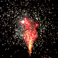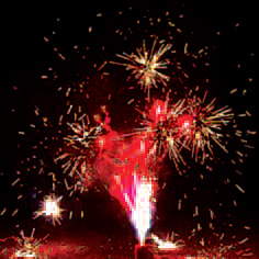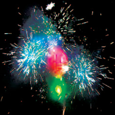 Потоки огней разного цвета, вспышки, трещащие разрывы, свист, цветные искры..