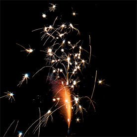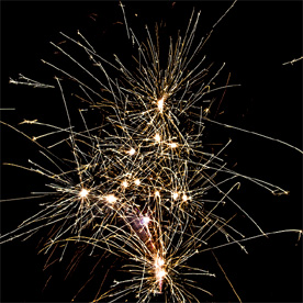 Красное пламя в основании и поток золотых звездочек; Поток золотых искр, разлетающихся трещащих серебряных огней.