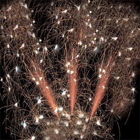 Фонтаны расположены в виде веера - поток золотых, серебряных трещащих разлетающихся искр, красных и синих огней.