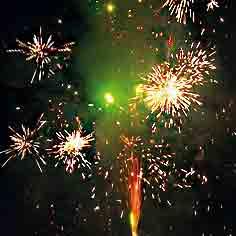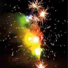 Поток белых разлетающихся шуршащих вспышек и зеленых огней. Поток золотых трещащих вспышек и зеленых, красных огней.