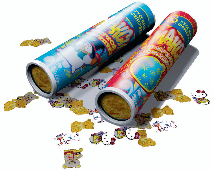 Эффект: Выстреливает конфетти и сюрприз - термонаклейку Размеры: 120х30 мм