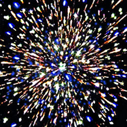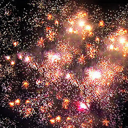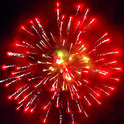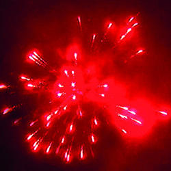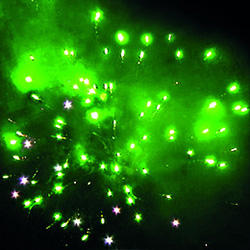 Красные или зеленые или синие звезды с белыми хвостами и белые трещащие искры. Вертушка разрывается облаком трещащих разрывов. Шуршащая комета разрывается красными звездами с белым мерцанием. Белые хвосты с треском. Из шуршащих комет появляются белые разлетающиеся огоньки. Красочная концовка: сфера зеленых звезд и облако трещащих разрывов.