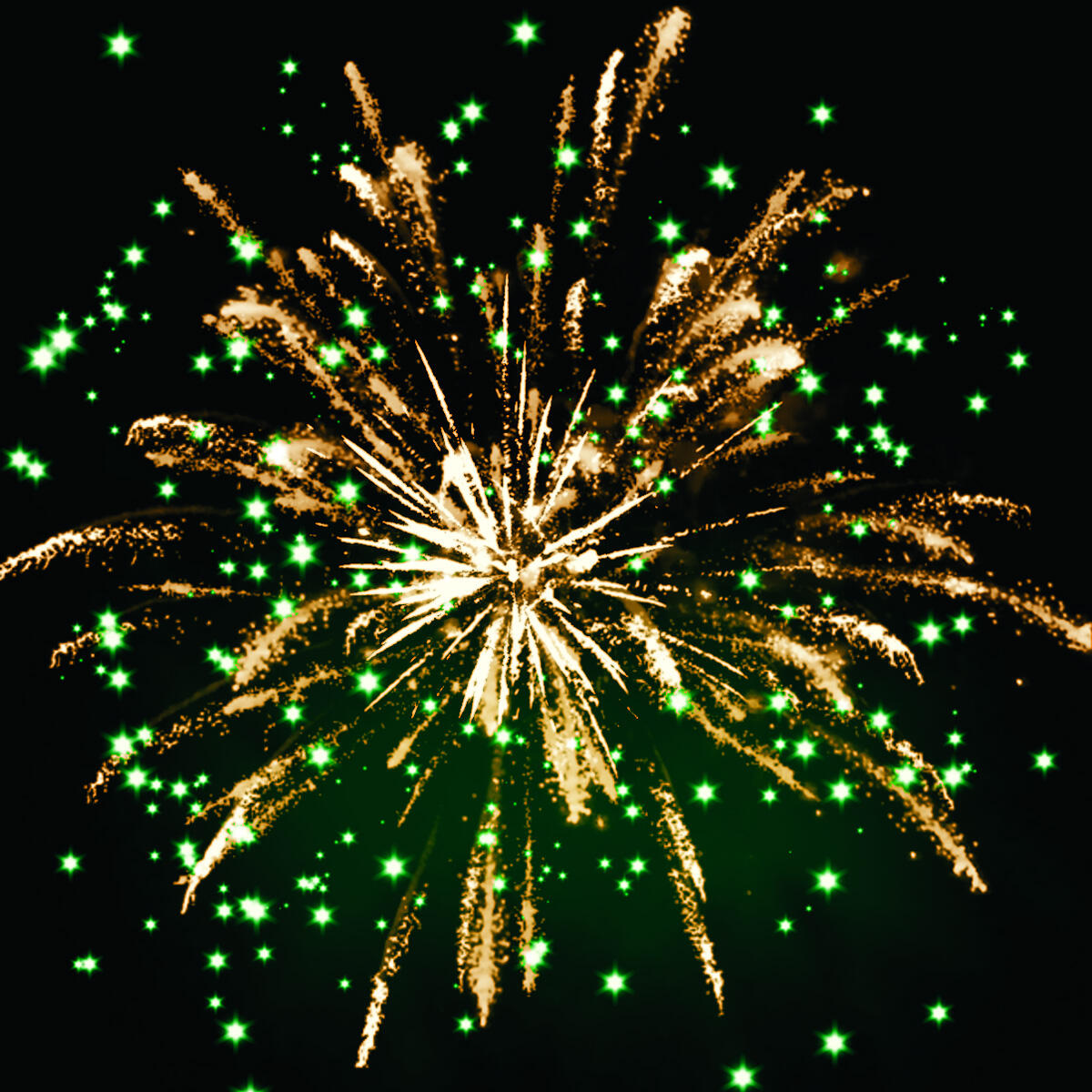 5. золотых форсов с трещащими искрами на концах и зелёных мерцающих огней (залп).