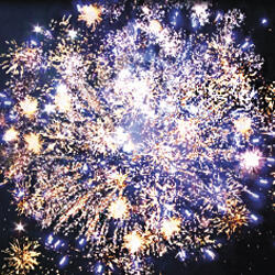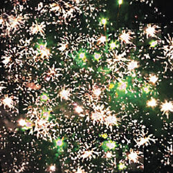 2. ЗАЛП: Множество серебряных ниспадающих нитей (парча), красные звезды и облако треска (трещащий дождь);