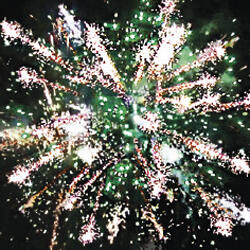 8. ФИНАЛЬНЫЙ ЗАЛП: Фиолетово-синяя сфера (пион), серебряные звезды с пышными трещащими хвостами (трещащий кокос) и облако треска (трещащий дождь).