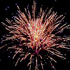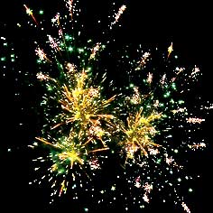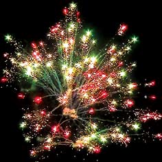 Красная звезда разрывается синими звездами и красными огнями. Зеленая звезда разрывается зелеными мерцающими звездами и золотыми шуршащими хвостами. Красная звезда разрывается красными и зелеными звездами переходящими в треск. Синяя звезда разрывается синими звездами и золотыми хвостами. Разрыв сферой золотых хвостов. Разрыв гроздями разноцветных падающих звезд. Залп искристых шуршащих комет разрывается красными и зелеными звездами, переходящими в облако трещащих звезд.