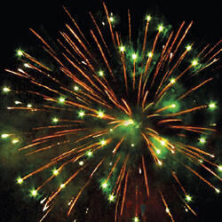 8. Финальный залп: Красно-зеленая сфера (пион) и облако треска (трещащая хризантема).