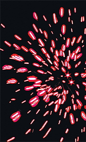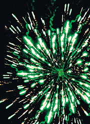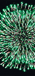 8. фиолетовых, зеленых огней, золотых форсов и множества трещащих сфер. Красочная концовка из нескольких залпов.