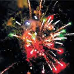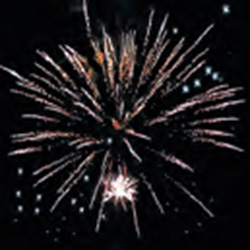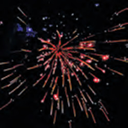 Разноцветные кометы, серебряные трассы разрываются сферами из: красных огней и трещащих разлетающихся серебряных искристых огней; красных огней и серебряных форсов; синих огней и золотых форсов с красными мерцающими искрами; трещащих серебряных и красных – зеленых огней с форсами; красных, синих и серебряных мерцающих огней; серебряных форсов. В конце залп.