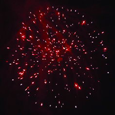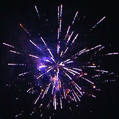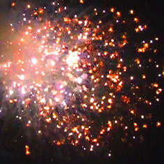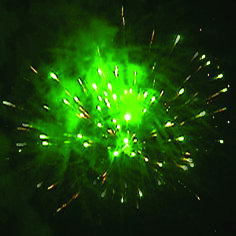 Цветные звезды разрываются красными и серебристыми сферами, зелеными, золотыми сферами с мерцанием, серебряными искристыми хвостами с треском, золотыми хвостами с синими звездами на концах. Залп зеленых звезд разрывается золотой сферой с мерцанием и треском.