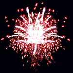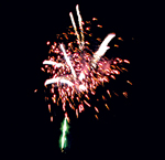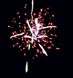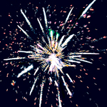 Разноцветные кометы разрываются огромными серебряными пальмами с яркими синими, красными, зелеными шариками на кончиках на фоне золотых мерцающих звезд.