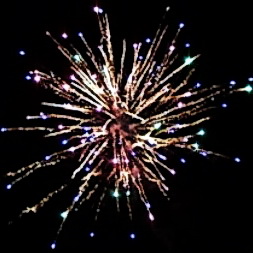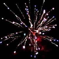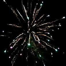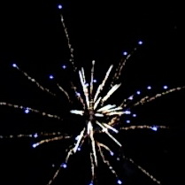 Разрывы золотыми хризантемами с красными, синими, зелеными кончиками.